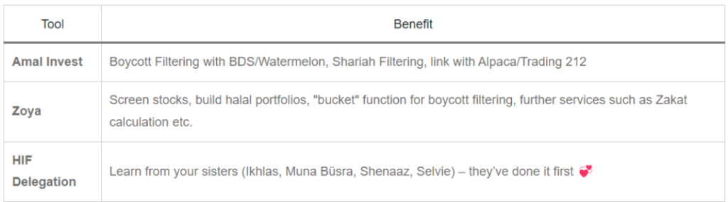 • Open an account with a low-cost broker (like Trading 212, Alpaca or Interactive Brokers) and sync it with Amal Invest or Zoya.